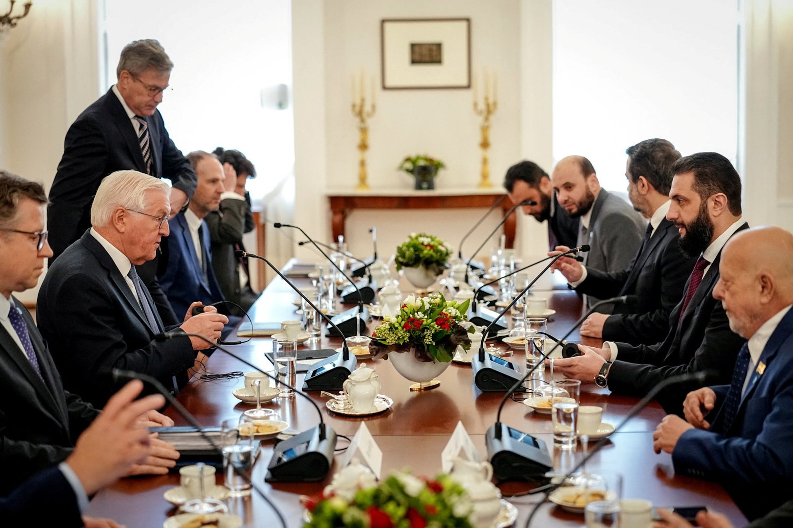 - أحمد الشرع: أكد على دور العائدين من ألمانيا في إعادة الإعمار بخبراتهم، ودعا لتعاون مشترك لعودة آمنة وكريمة. وصف سوريا بـ«ملاذ آمن» و«فرصة مهمة للشركات الألمانية» بفضل موقعها الاستراتيجي ومواردها البشرية.