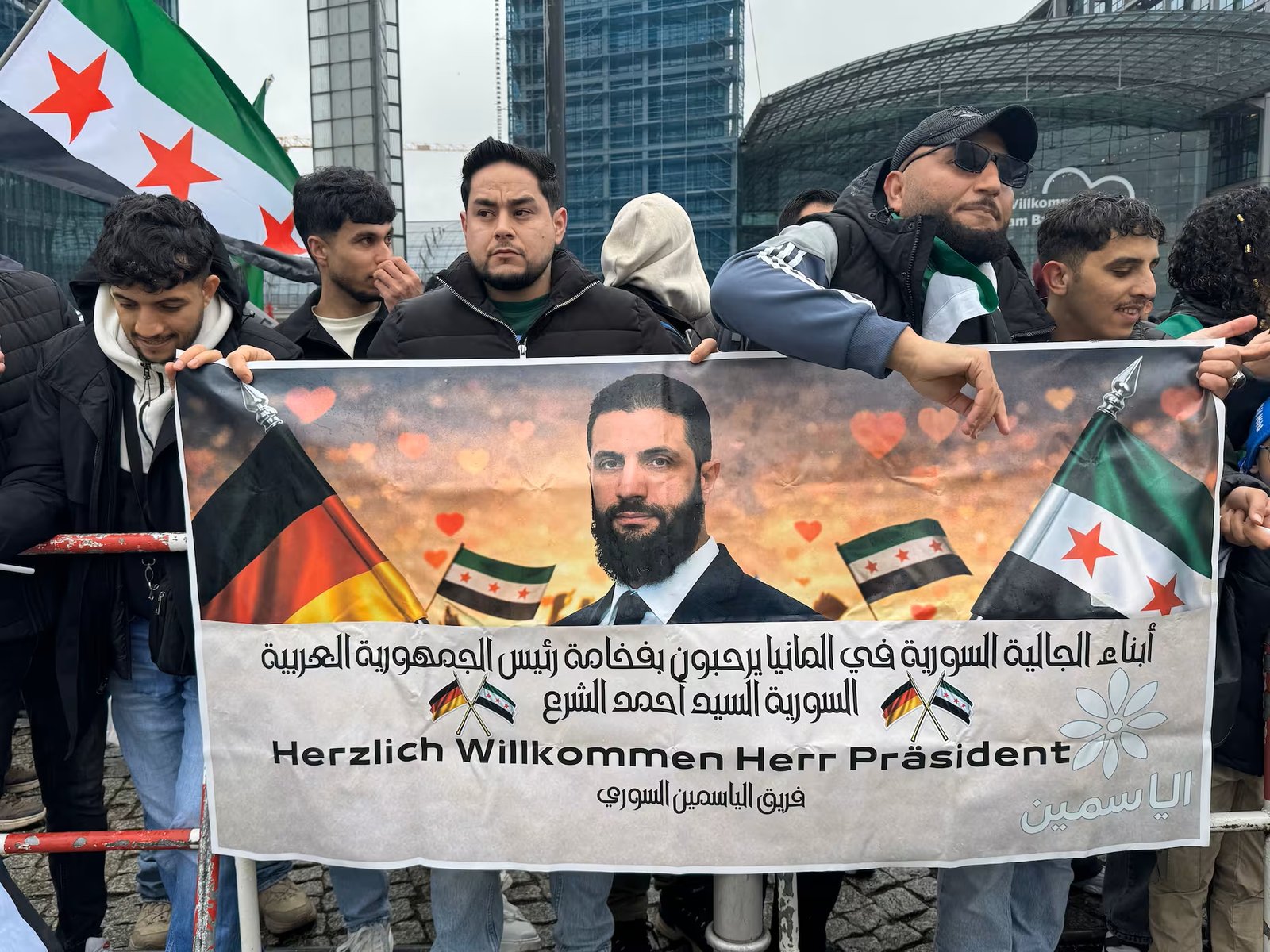 - لقاء مع أبناء الجالية السورية في ألمانيا وأوروبا جرى فور الوصول في مقر الإقامة. حضر الشرع برفقة الشيباني.