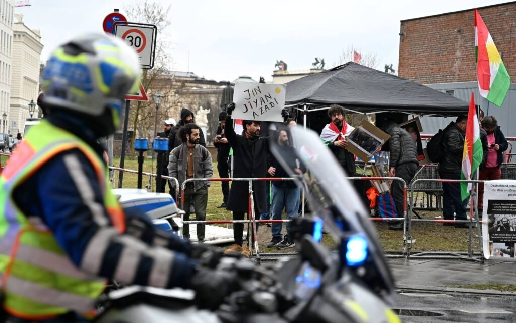 ركزت على الإجراءات الأمنية الكبيرة (إغلاقات مرورية، حظر تجمعات، دعم من وحدات خارجية)، والاحتجاجات المحدودة (نصف دزينة أمام Großer Stern و15 شخصاً أمام الخارجية)، مقابل تجمع مؤيد صغير (حوالي 150 شخصاً). أكدت أن المواضيع الرئيسية هي الإعمار والعودة الطوعية للاجئين.
