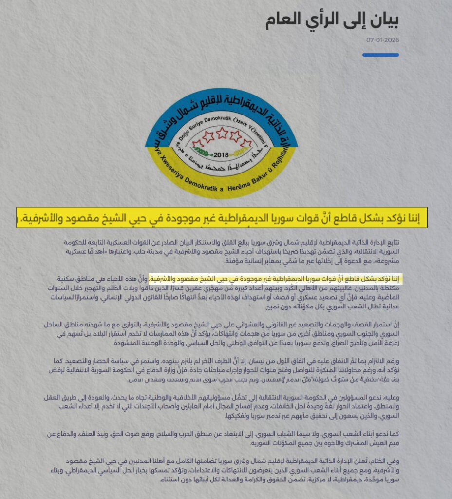وأضافت الحكومة السورية في بيانها أن “تأكيد قوات سوريا الديمقراطية، عدم وجودها العسكري داخل مدينة حلب، كما ورد في بيانها، يُعد إقراراً صريحاً يُعفيها كلياً من أي دور أو تدخل في الشأن الأمني والعسكري للمدينة، ويؤكد أن المسؤولية الحصرية عن حفظ الأمن وحماية السكان تقع على عاتق الدولة السورية ومؤسساتها الشرعية”.