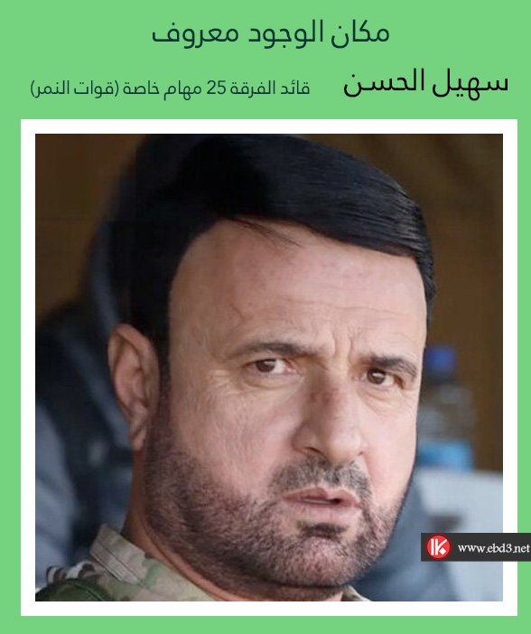 سهيل الحسن، لواء سابق والقائد السابق للفرقة 25 مهام خاصة، المعروفة باسم قوات النمر. خلال الحرب الأهلية السورية، أصبح السيد الحسن أحد أبرز القادة العسكريين في صفوف نظام الأسد، وقاد هجمات كبرى في حلب وإدلب. عُرف بتكتيكاته الوحشية، واعتماده على الدعم العسكري الروسي، وولائه للرئيس بشار الأسد. وفي عام 2024، عُيّن قائداً عاماً لقوات العمليات الخاصة في سوريا.