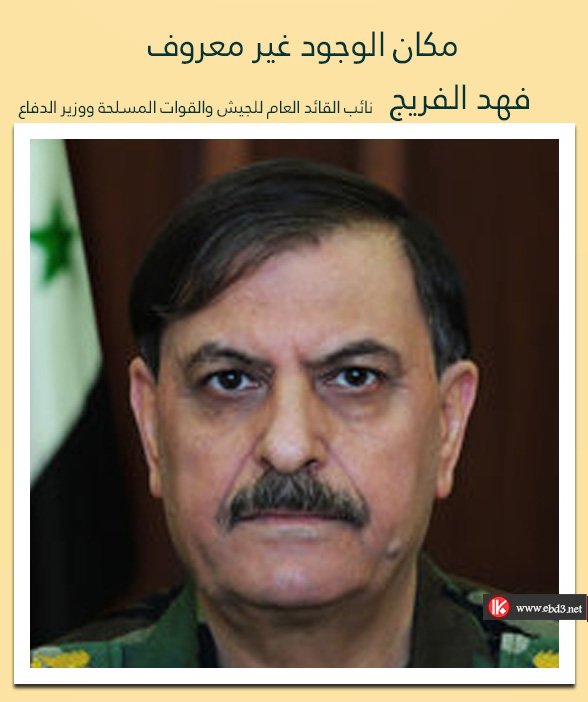فهد الفريج، فريق أول سابق، شغل منصب وزير الدفاع في سوريا من تموز/يوليو 2012 حتى كانون الثاني/يناير 2018. وهو ضابط عسكري قضى مسيرته المهنية في صفوف الجيش حيث تدرّج في الرتب حتى أصبح رئيس هيئة الأركان العامة في عام 2011، بالتزامن مع اندلاع الحرب الأهلية في سوريا. وبحسب الأمم المتحدة، فقد اتسمت فترة ولايته بعمليات عسكرية واسعة النطاق وأعمال عنف عشوائية ضد المدنيين، من بينها الاستخدام الواسع للبراميل المتفجّرة — عبوات ناسفة مُرتجلة تُلقى من المروحيات — في مناطق مكتظة بالسكان. وفي عام 2023، وجّه الادعاء الفرنسي إلى السيد الفريج تهماً بارتكاب جرائم حرب على خلفية هجوم ببرميل متفجر في درعا عام 2017، أسفر عن مقتل المواطن الفرنسي-السوري صلاح أبو نبوت.