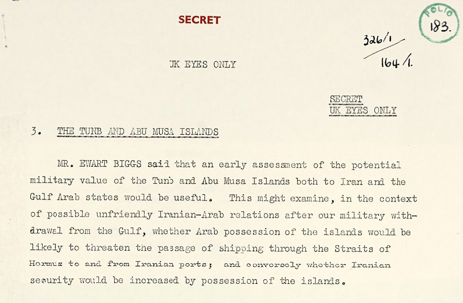 الوثيقة، التي طلب فيها مسؤول الخارجية إيوارت بيغز تقييماً عسكرياً مبكراً لجزر طنب الكبرى والصغرى وأبو موسى، لم تكن مجرد مذكرة داخلية عابرة.