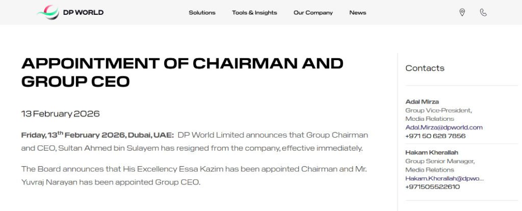- Bloomberg: https://www.bloomberg.com/news/articles/2026-02-13/dp-world-names-yuvraj-narayan-as-ceo-essa-kazim-as-chairman