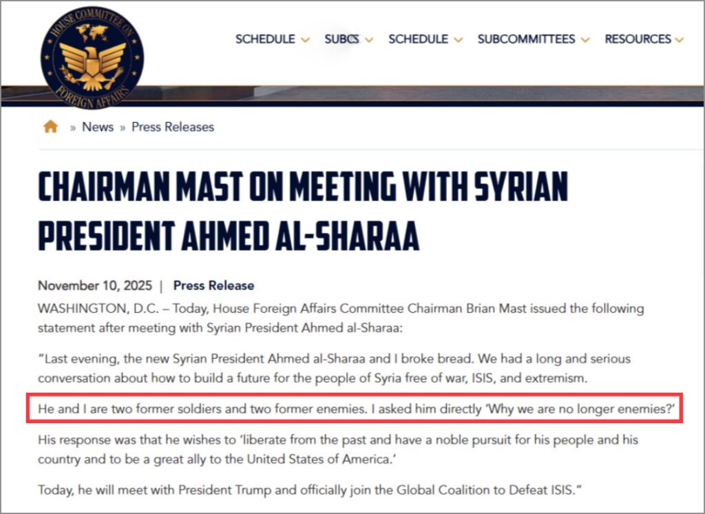 وخلال عطلة نهاية الأسبوع، التقى الشرع بالنائب الجمهوري براين ماست (عن ولاية فلوريدا)، رئيس لجنة الشؤون الخارجية في مجلس النواب، وهو من أبرز المعارضين لرفع “قانون قيصر”. ويُنظر إلى ماست على أنه العقبة الرئيسية أمام تمرير مشروع قانون تسوية بين المشرّعين.