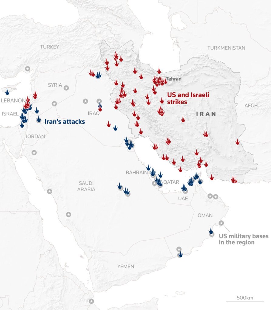 - البحرين: مطار البحرين الدولي (أضرار في مبنى شاهق، قتيل واحد، إصابات متعددة)، قاعدة الأسطول الخامس الأمريكي (هجمات بمسيرات، حرائق)، مصنع تحلية ماء (هجوم مسير في 7 مارس، أضرار في الإنتاج). الخسائر: قتيلان، 10 جراحى. رد البحرين: وصف الهجمات بـ”انتهاك سيادة”، استدعاء سفير إيران.