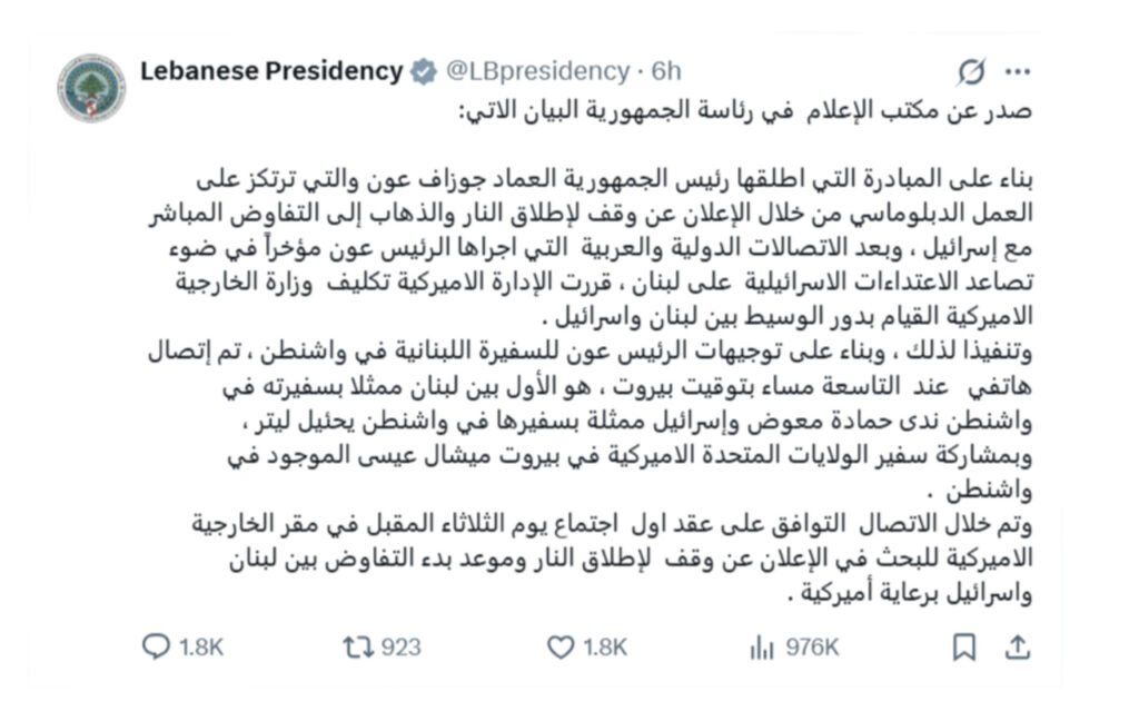 وبحسب البيان، فقد تم خلال الاتصال التوافق على عقد أول اجتماع رسمي يوم الثلاثاء المقبل في مقر وزارة الخارجية الأمريكية في واشنطن، لبحث الإعلان عن وقف إطلاق النار بين الجانبين، إضافة إلى تحديد موعد بدء مفاوضات أوسع بين لبنان وإسرائيل تحت رعاية أمريكية.