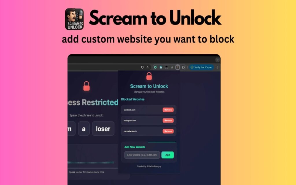 يمكن للمستخدم إضافة أي موقع آخر يسبب الإلهاء، مثل منصات الفيديو أو المنتديات. بذلك تصبح Scream to Unlock أداة شخصية لإدارة الانتباه، ترتكز على ربط السلوك غير المرغوب فيه بتجربة مزعجة نفسيًا.