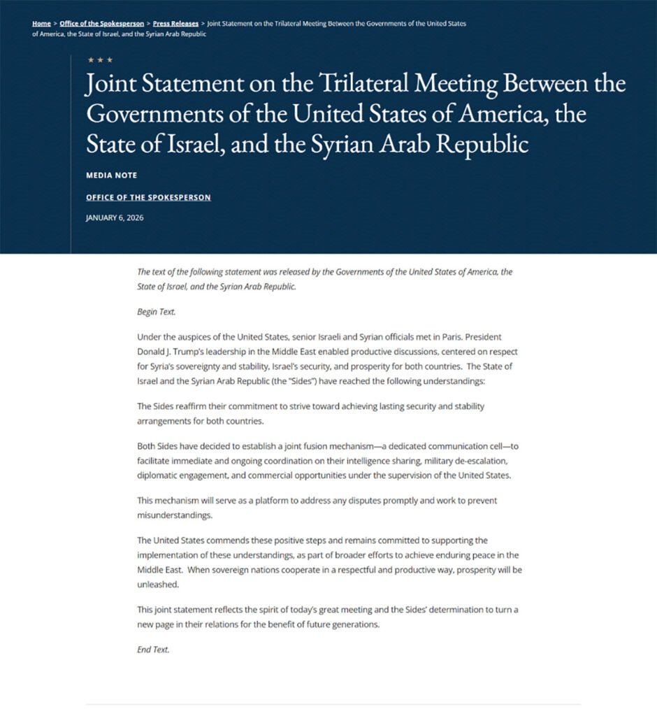 جاء ذلك خلال بيان مشترك صدر عن الولايات المتحدة وإسرائيل وسوريا، عقب مباحثات انعقدت ليومين في باريس.