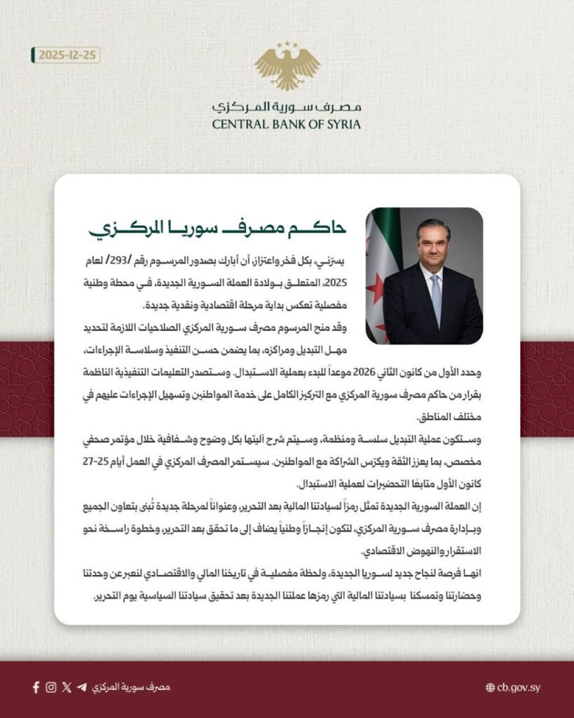 وأوضح أن “المرسوم 293 منح مصرف سوريا المركزي الصلاحيات اللازمة لتحديد مهل التبديل (الأوراق النقدية الجديدة بالقديمة) ومراكزه، بما يضمن حسن التنفيذ وسلاسة الإجراءات، وحدد الأول من يناير/ كانون الثاني 2026 موعدا للبدء بعملية الاستبدال”.