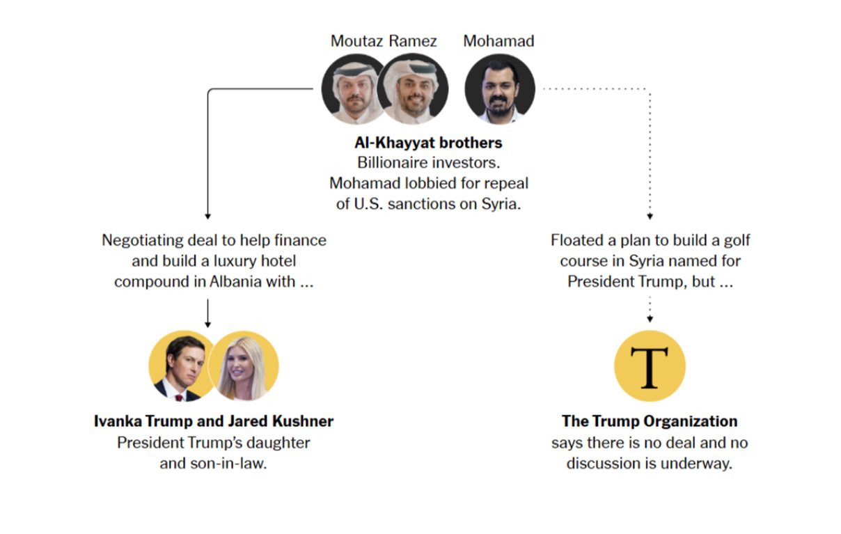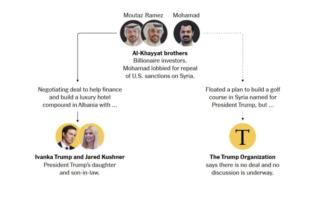 فبينما كانت إدارة ترامب والكونغرس يتحركان العام الماضي لإلغاء العقوبات المفروضة على سوريا، كانت العائلة المقيمة في قطر — والتي يُرجَّح أنها الأكثر استفادة من ذلك — تجري بشكل خاص مفاوضات حول شراكة عقارية مع جاريد كوشنر، وتطرح في الوقت نفسه فكرة إنشاء ملعب غولف يحمل اسم ترامب في سوريا.