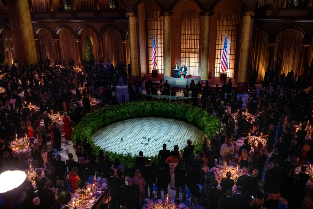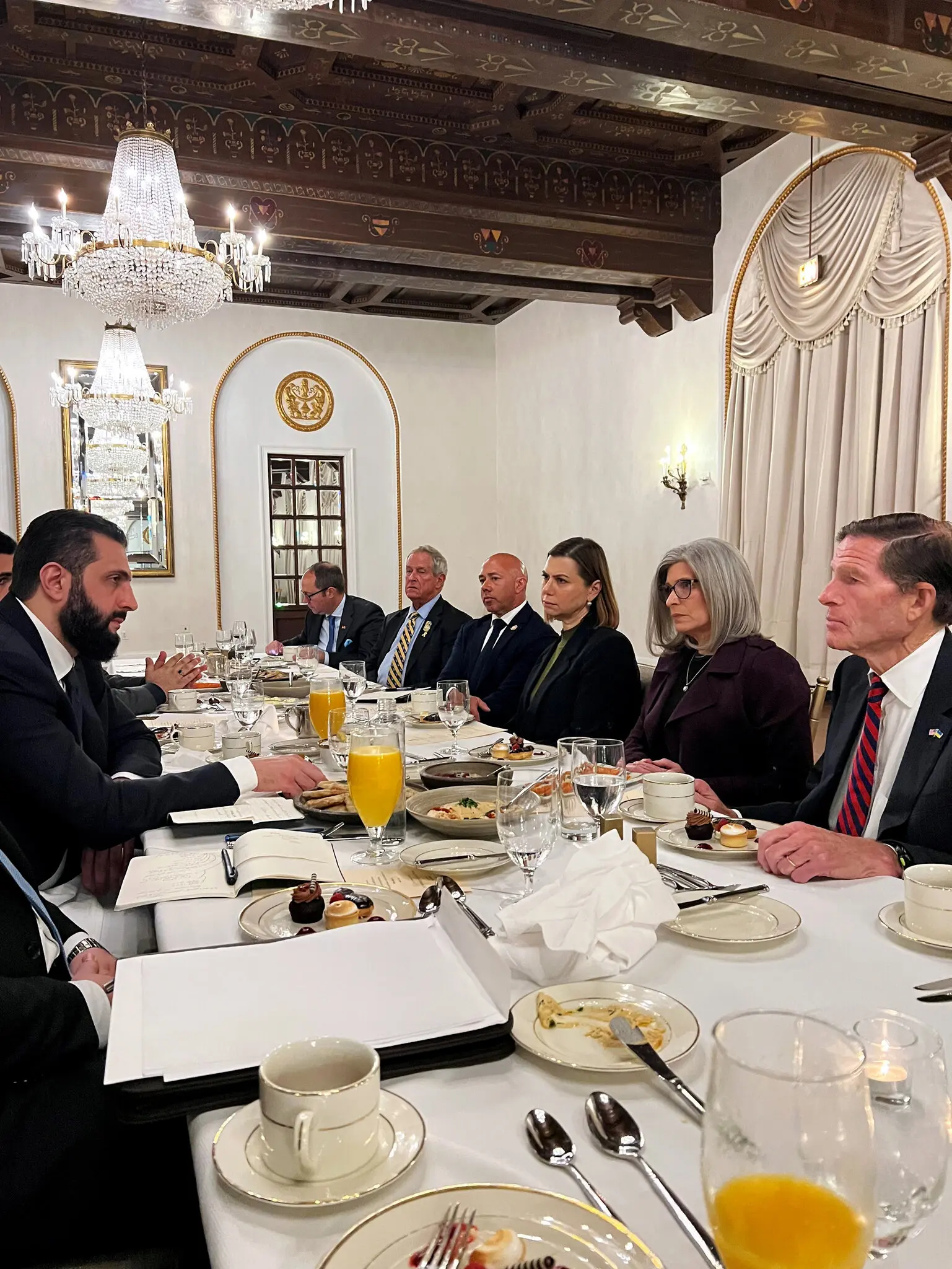 وفي فندق سانت ريجيس، على بعد ثلاثة شوارع من البيت الأبيض، اجتمع السيد ماست وأعضاء آخرون في الكونغرس، من بينهم السيد ويلسون، مع السيد الشرع على مأدبة عشاء خاصة.
