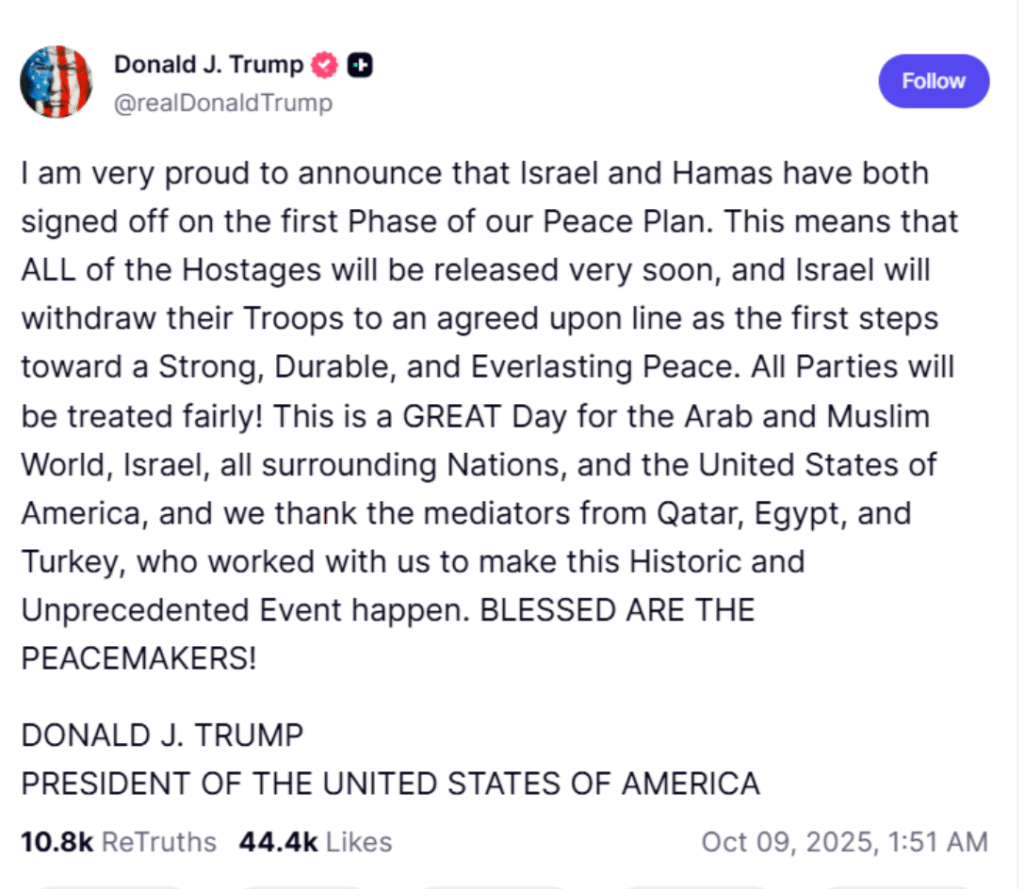 أعلن الرئيس الأمريكي دونالد ترامب أن إسرائيل وحماس وقعتا اليوم الخميس، على المرحلة الأولى من خطته لوقف الحرب في قطاع غزة وتبادل الأسرى.