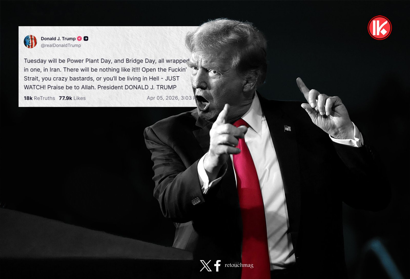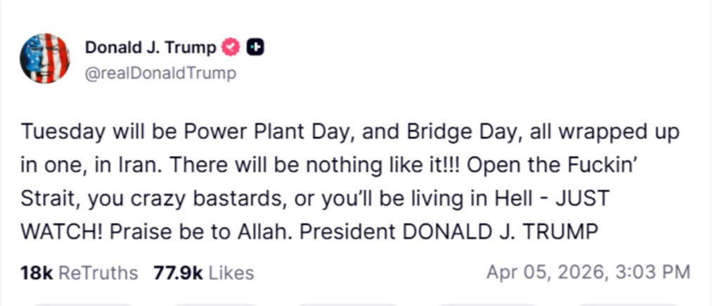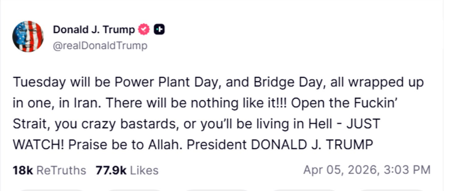 “سيكون يوم الثلاثاء يوم محطات الطاقة ويوم الجسور، كلهما مجتمعين في يوم واحد في إيران!!! لن يكون هناك شيء مثل هذا!!! افتحوا المضيق اللعين بحق الجحيم، أيها الأوغاد المجانين، وإلا ستعيشون في الجحيم — فقط راقبوا!!! الحمد لله.