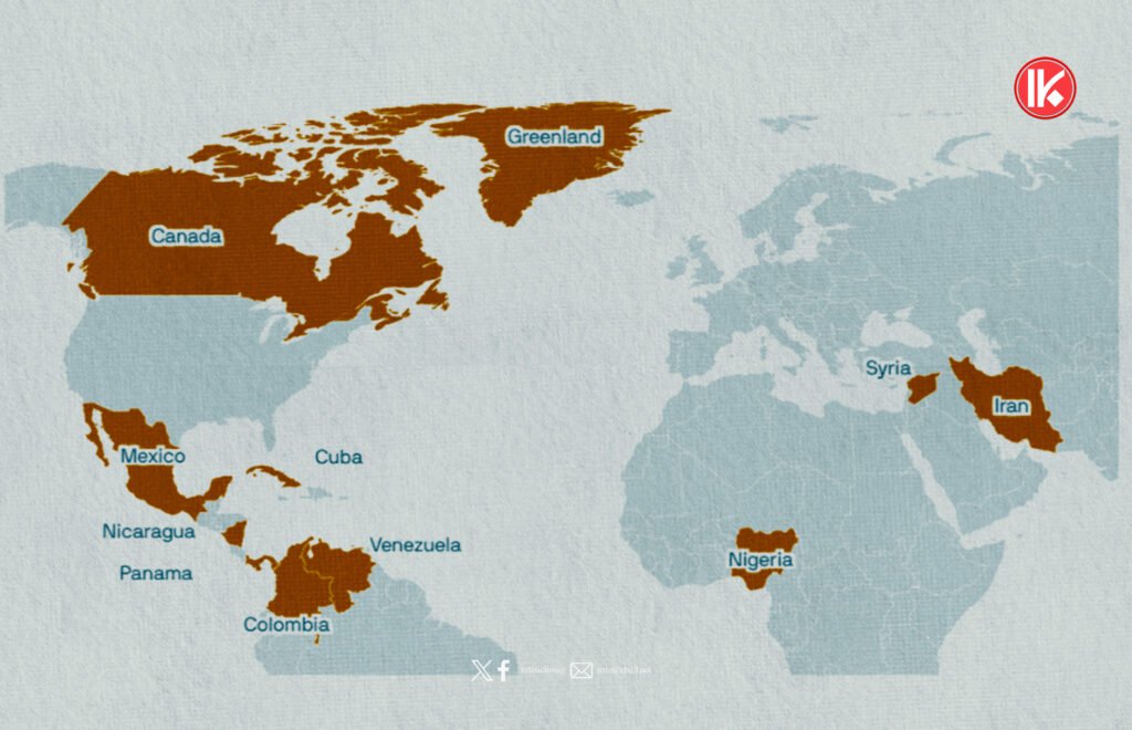 وفي مراحل مختلفة من رئاسته، هدّد ترامب أيضاً كلاً من غرينلاند وكندا وسوريا.