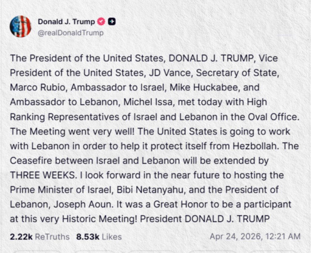 أعلن الرئيس الأمريكي دونالد ترامب عن تمديد وقف إطلاق النار بين إسرائيل ولبنان لمدة ثلاثة أسابيع، وذلك بعد اجتماع رفيع المستوى بين مسؤولين أمريكيين وممثلين عن تل أبيب وبيروت.