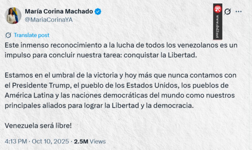 ماريا كورينا ماتشادو، المرأة التي وُصفت بأنها “لا تُهزم”، نالت الجائزة عن معارضتها ونضالها ضد مادورو، لكنها وجدت نفسها فجأة في مشهد آخر: جائزة سلام تتحول إلى عرض دعائي لتحالف دولي. كتبت على X في 10 أكتوبر 2025: