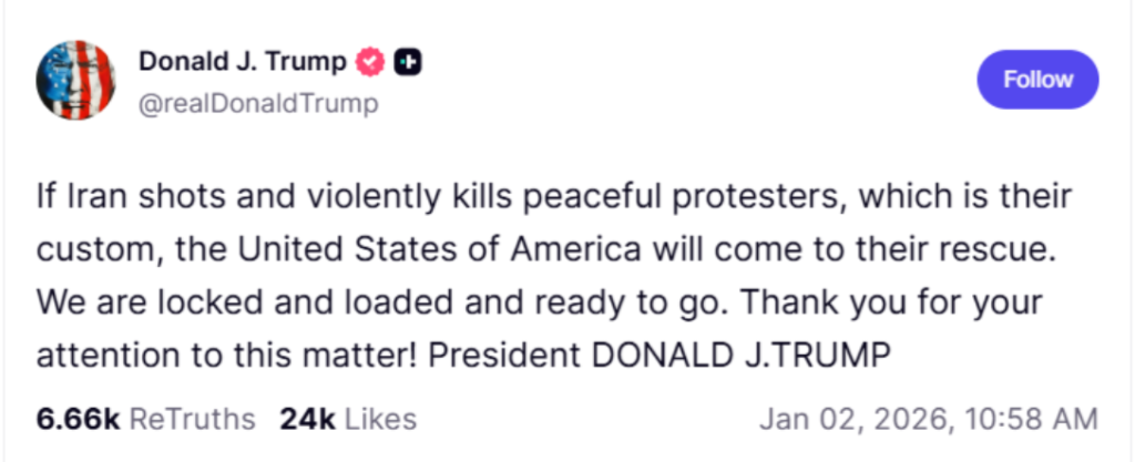 هدّد الرئيس الأميركي دونالد ترامب، يوم الجمعة، بالتدخل لمساندة المحتجين في إيران إذا أطلقت قوات الأمن النار عليهم، وذلك بعد أيام من اندلاع اضطرابات أسفرت عن سقوط عدد من القتلى وشكّلت أخطر تهديد داخلي للسلطات الإيرانية منذ سنوات.