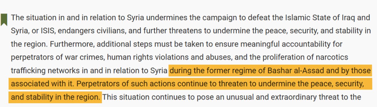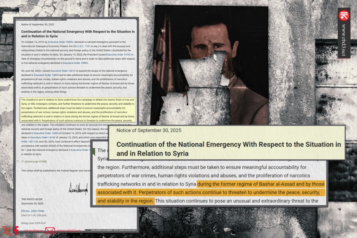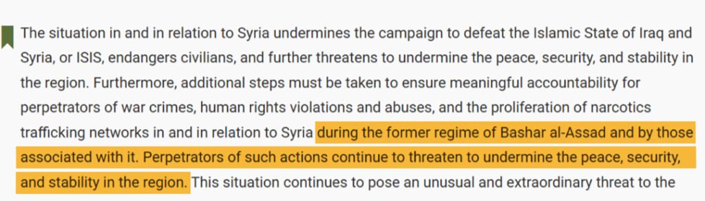 وبذلك، فإن التمديد يوجَّه تحديدًا ضد بقايا النظام السابق والمتورطين في ممارساته. وهو ما يعكس القلق الأميركي من تأثير الجرائم السابقة على الاستقرار الإقليمي، فضلًا عن ارتباطها المباشر بأمنها القومي.