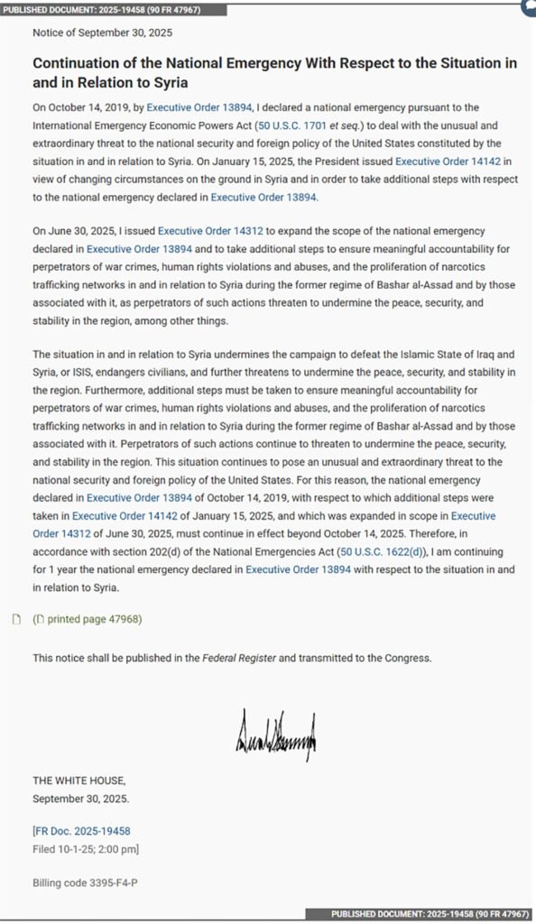 - الحالة الثانية: أُعلنت عام 2019 عبر المرسوم الرئاسي (13894) خلال إدارة ترامب، وتتعلق بالانتهاكات الجسيمة لحقوق الإنسان وجرائم الحرب وشبكات المخدرات التي ارتكبها نظام بشار أسد ومن ارتبط به. هذه هي الحالة التي أبقاها البيت الأبيض ووسع نطاقها في حزيران/يونيو 2025، ثم مدّدها مجددًا في أيلول/سبتمبر 2025.