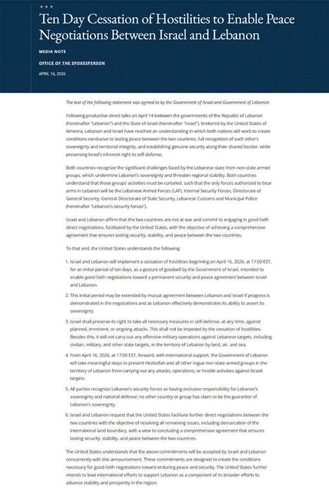 - اعتبارًا من 16 أبريل 2026 الساعة 17:00 بتوقيت شرق الولايات المتحدة، ومع الدعم الدولي، ستتخذ حكومة لبنان خطوات ملموسة لمنع حزب الله وجميع الجماعات المسلحة غير النظامية الأخرى داخل الأراضي اللبنانية من تنفيذ أي هجمات أو عمليات أو أنشطة عدائية ضد أهداف إسرائيلية.