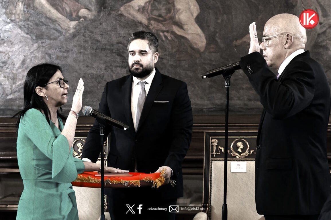 ديلسي رودريغيز، نائبة نيكولاس مادورو، تؤدي اليمين رئيسةً مكلّفة للجمهورية أمام شقيقها خورخي رودريغيز، رئيس الجمعية الوطنية، بينما يتولى نيكولاس مادورو غيرا، نجل الرئيس المعتقل بعملية عسكرية تخطّت القانون الدولي، حمل دستور البلاد خلال مراسم التنصيب.
